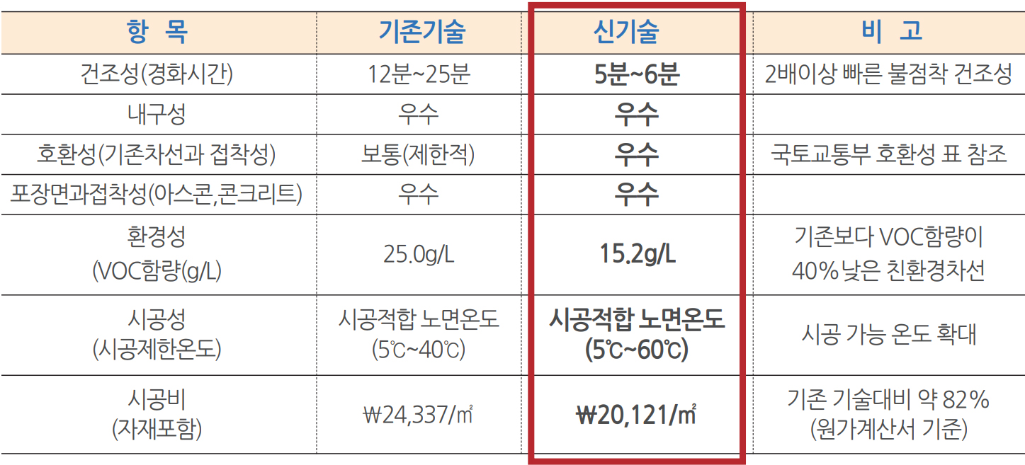 VOC(휘발성 유기화합물)함량이 기존 차선보다 낮은 친환경 차선임.