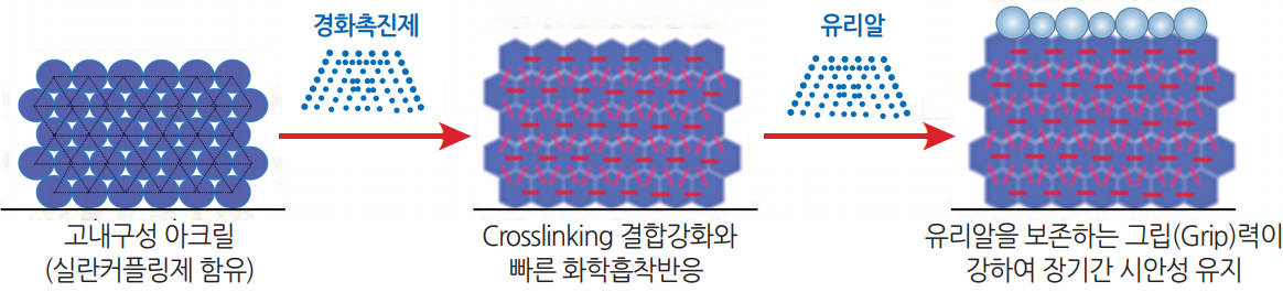 주재와 경화촉진제의 교차결합(crosslinking)과 빠른 화학흡착반응으로 내구성과 속건성이 우수함. |
